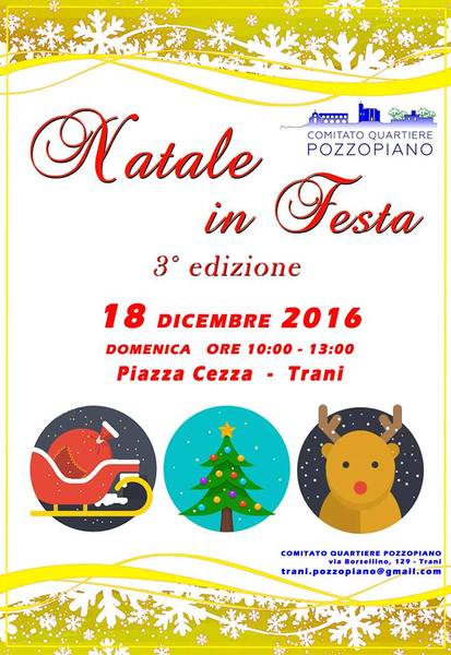 Domenica 18 dicembre, dalle 10 alle 13, il Comitato di Quartiere “Pozzopiano” organizza la III Edizione del “Natale in festa”, con lo scopo di portare i colori e le atmosfere natalizie anche nella periferia sud della città. Quest’anno l’evento si terrà in Piazza Cezza (alle spalle dell’Ist. delle Suore Angeliche - Zona Ospedale) e tale scelta non è per nulla casuale.