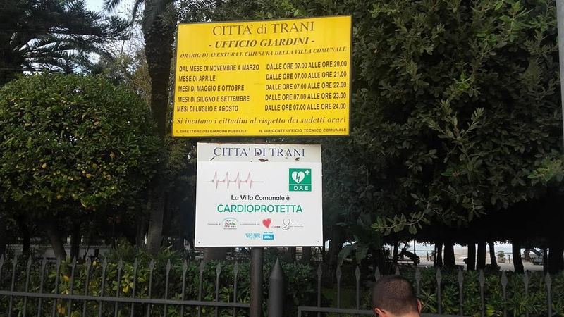 Bella da vedere (con le suggestive luminarie natalizie ad impreziosire i suoi viali), sicura da vivere. La villa comunale di Trani può considerarsi un’eccellenza cittadina, per tantissimi motivi. Da alcune settimane il giardino che si affaccia per tre lati sul mare è anche uno spazio cardioprotetto. Merito di questa evoluzione va all’Aps Città dell’Infanzia. Dopo aver donato alla villa un defibrillatore (a conclusione della Notte bianca dei bambini dello scorso 8 ottobre) l’associazione ha portato a conclusione il suo percorso, con l’aiuto della onlus Gesti di Vita, organizzando un corso di formazione per operatori comunali mirato al corretto utilizzo del defibrillatore ed alla conoscenza di pratiche di primo soccorso, adulto e pediatrico.