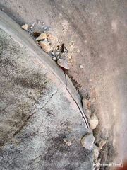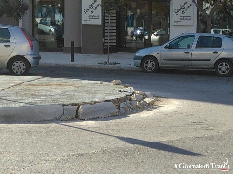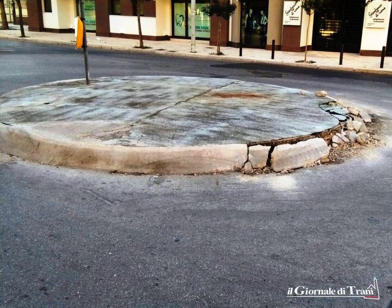 Le rotatorie di via Istria non sembrano trovare pace. Questa volta (o meglio, ancora una volta) tocca alla rotonda di raccordo tra via Falcone, via Perrone Capano e la suddetta via. Infatti, il cordolo che la circoscrive risulta da un lato completamente sgretolato. Non è chiara la causa di tale deterioramento: probabile possa essere stato uno dei tanti camion o auto che ogni giorno transitano di là; anche perché la restante porzione di cordolo è ancora perfettamente integra, segno, quindi, che non può essere in atto alcun cedimento.