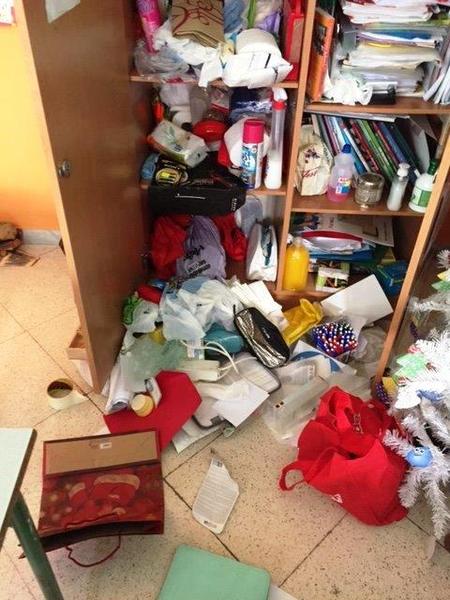 Cassette di sicurezza e serrature forzate ed irrimediabilmente danneggiate, armadi a soqquadro, pavimenti ricoperti di materiale buttato alla rinfusa, senza il minimo rispetto per i sacrifici che ad una Scuola ed ai docenti toccano, per fornire strumenti adeguati ad un’utenza ed un quartiere particolarmente bisognoso.