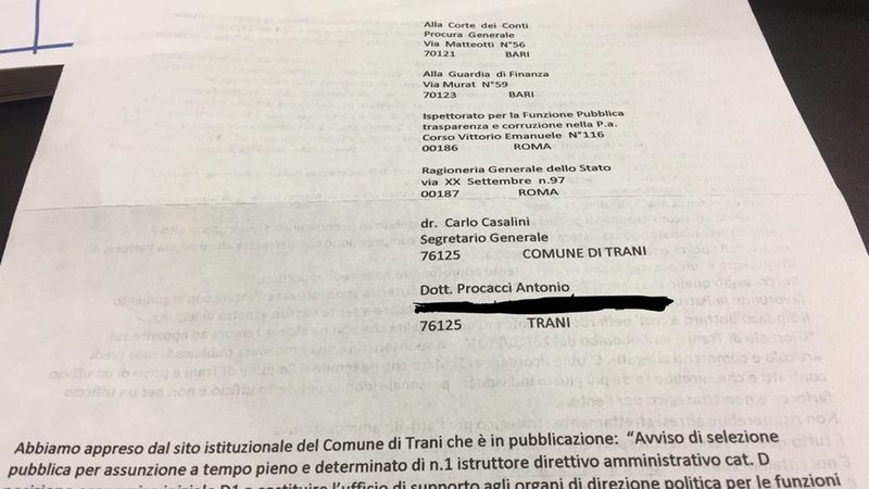 In verità, per noi non si tratta di una vera e propria notizia atteso che, a inizio novembre, abbiamo ricevuto una lettera anonima (indirizzata anche, tra gli altri, alla Corte dei Conti e alla Guardia di Finanza) in cui si ipotizzava che quell'avviso sarebbe stato vinto dalla dottoressa Patruno, che a quanto pare era o è dipendente dell'Autorità garante della concorrenza e del mercato di Roma.