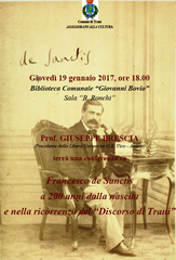 Giovedì 19 gennaio, alle 18, il professor Giuseppe Brescia, filosofo storico e critico, terrà una Lectio magistralis su Francsco de Sanctis, maestro di vita intellettuale e civile, nella ricorrenza del bicentenario della sua nascita e in ricordo dell'elevato "Discorso di Trani".