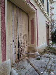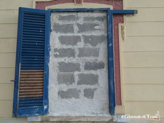 All’ingresso, ci accoglie un bidone per il conferimento dei rifiuti. Rotto. In adiacenza della villa, la protezione in cartongesso è caduta, forse per via del forte vento, anche se non si esclude che qualcuno possa averla buttata giù. L’ingresso del fabbricato attiguo è stato chiuso con travi di legno decisamente poco sicure. Una delle finestre è stata murata, sicuramente per impedire eventuali accessi abusivi.