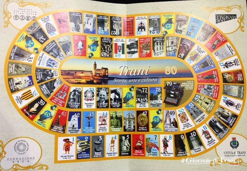 Il tempo delle feste di Natale è finito, ma non quello dei giochi di società. Anzi, si può tranquillamente rilanciarlo alla luce di una bella idea che valorizza la storia della città: è il gioco dell'oca confezionato dalla Fondazione Seca, da un'idea di Francesco Pagano, già presidente dell'associazione Obiettivo Trani e fratello del promotore della stessa fondazione, Natale. Il progetto ha trovato anche il gradimento del Comune di Trani, che ha concesso il patrocinio gratuito e la stampa del proprio logo in un angolo del tabellone, insieme con quella del Polo museale, di cui la fondazione è gestore, presso cui il gioco sarà presto in vendita.