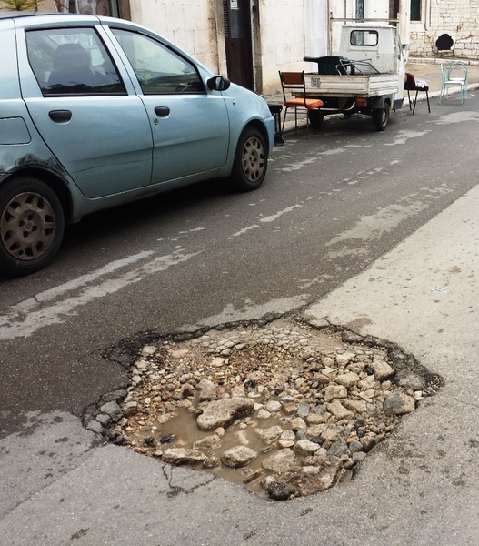 Abbiamo scelto, in maniera simbolica, l'enorme buca che si è aperta in via Alvarez, fra via Giovanni Russo e via Romito, che occupa buona parte del tratto immediatamente successivo alla strettoia, in direzione di via Mario Pagano.