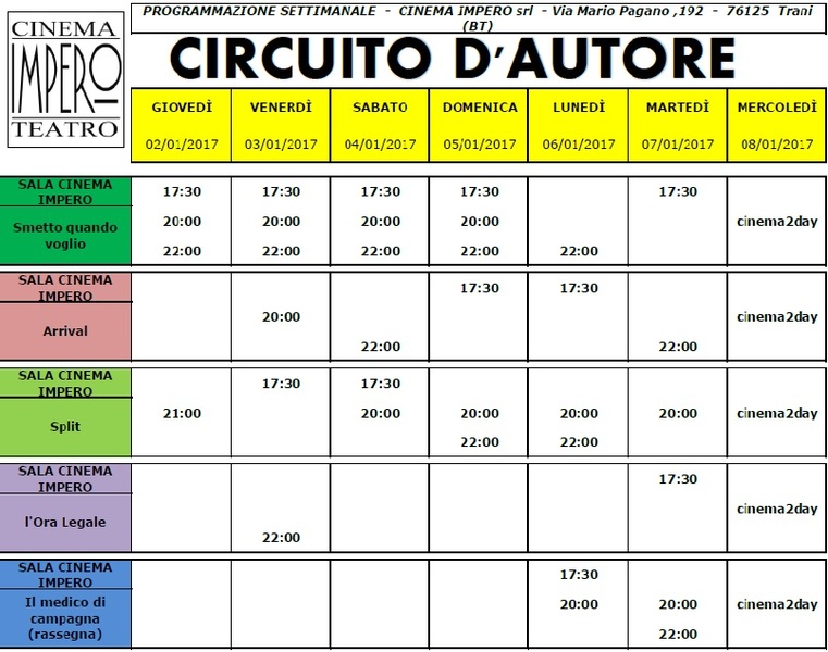 Di seguito la programmazione del cinema Impero di Trani, in via Mario Pagano 192.