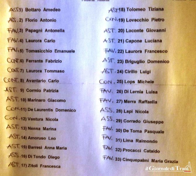 La sospensiva del provvedimento, richiesta da Tomasicchio e Laurora, è stata approvata con 10 voti favorevoli, 7 contrari e 11 astenuti (come da prospetto accanto). Pertanto, il provvedimento è stato ritirato: poiché la scadenza di legge era fissata per oggi, la rottamazione delle cartelle, a Trani, salta. E per Bottaro, stavolta, è davvero crisi.