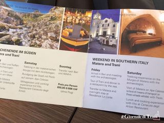 Trani sarà presentealla Fiera grazie all’associazione Udis.ch, Unione di italiani e svizzeri,il cui segretario generale è il tranese Massimo Pillera: «L’Udis quest’anno ha dato la possibilità alla città di Trani di essere presente alla fiera internazionale del turismo insieme a Nardò, Galatone e Matera a costo zero. Con la fiera della Svizzera orientale, si è chiuso un accordo per cui la Puglia l’anno prossimo sarà ospite d’onore, e l’Udis gestirà e sarà la regia di questo padiglione di 200 metri quadri».