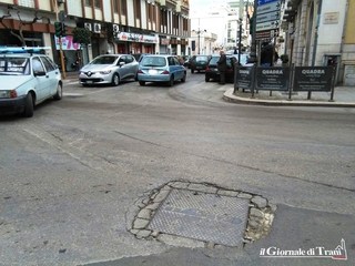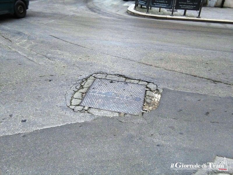 Un tombino in pieno incrocio semaforico, tra corso Imbriani, corso Italia e corso Vittorio Emanuele, sembra in procinto di cedere sotto il peso del costante passaggio dei veicoli.