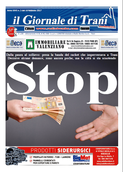Ad aprire il nostro nuovo numero de "Il giornale di Trani", in edicola, l'indagine dei Carabinieri della compagnia di Bari e della Procura di Trani in merito alla "banda del pizzo", che imperversava a Trani. Continua la nostra rubrica "Sei piazze (e più) in cerca d'autore", a cura di Stefano Mastromauro. Articoli sui costi della politica, le consulenze esterne del Comune di Trani, approfondimenti di cultura e sport. Tutto questo, in edicola, al costo di 1,50 euro.