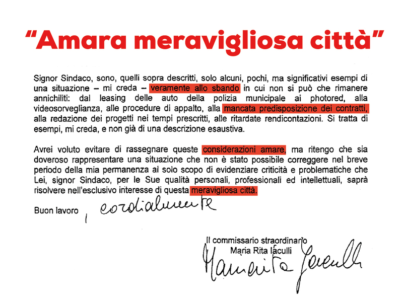 Il primo cittadino ci ha tenuto particolarmente a mostrare alla città i primi risultati del suo governo, partendo addirittura da una riservata personale dell'ex commissario straordinario, Maria Rita Iaculli, che Bottaro ha voluto rendere pubblica. Il delegato prefettizio, prima di lasciare il Comune di Trani e prima ancora di conoscere chi fosse realmente il suo successore, aveva scritto di «una città allo sbando, all'insegna della mancata predisposizione dei contratti, con pochi progetti e tanti problemi. Considerazioni amare - sottolineava - ma che Lei (il futuro sindaco, ndr) saprà risolvere nell'esclusivo interesse di questa meravigliosa città».
