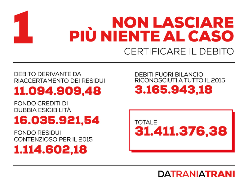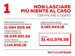 Da qui il percorso, dal titolo «Da Trani a Trani, vediamo come», in cui Bottaro è partito da un debito certificato di 31 milioni e mezzo di euro, per affrontare il quale si è deciso di tagliare subito su spese di rappresentanza e missioni, eventi sportivi e manifestazioni culturali, in modo da riconquistare la fiducia della Corte dei conti, che a novembre 2015 eliminava il limite all'impegno di spesa che gravò su Trani per un anno.