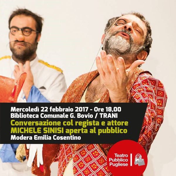 Oggi, alle 18, presso la biblioteca "Bovio", in piazzetta san Francesco, il regista e attore Michele Sinisi, che la sera stessa sarà sul palcoscenico del cinema teatro Impero con il suo "Miseria e nobiltà", incontrerà il pubblico. L'incontro, aperto a tutti, sarà moderato da Emilia Cosentino.