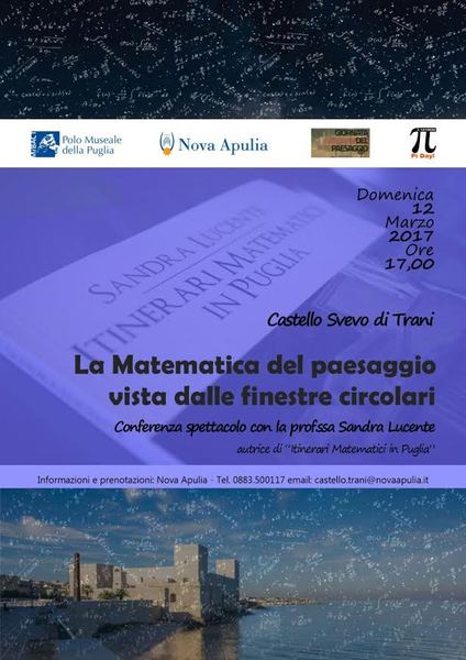 Oggi, domenica 12 marzo, alle 17, il castello di Trani, a pochi giorni dalla “Giornata del Pi greco”, celebrata da milioni di studenti e amanti della matematica, nonché dalla “Giornata nazionale del paesaggio”, promossa dal Mibact (entrambe quest'anno si celebrano il 14 marzo), ospiterà la professoressa Sandra Lucente, autrice del volume “Itinerari matematci in Puglia” (editore Giazira Scritture), con una conferenza spettacolo dal titolo “La matematica del paesaggio vista dalle finestre circolari".