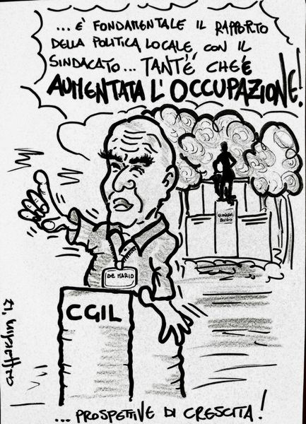Le due accezioni del termine occupazione: quella che un sindacato dovrebbe garantire, attraverso la sua attività istituzionale, e quella che, invece, è avvenuta nella ex sede dello stesso sindacato. Il caso Cgil diventa oggetto della nuova vignetta di «Tutto d'un tratto Trani», la rubrica satirica che inquadra, attraverso il disegno, i fatti principali della città. Vito De Mario, segretario della Camera del lavoro di Trani, tiene un comizio con la statua di Giovanni Bovio sullo sfondo ed utilizzando, peraltro, dichiarazioni recenti del sindaco Bottaro.