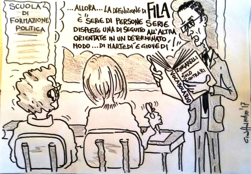 Proprio nel giorno in cui alcuni nuovi soggetti politici del centrodestra danno il via ad una scuola di formazione politica, con la presenza dell'ex sindaco Pinuccio Tarantini, il primo cittadino in carica, Amedeo Bottaro torna protagonista delle vignette della rubrica «Tutto d'un tratto Trani». E si propone, a sua volta, come relatore in una scuola di formazione politica «delle buone maniere».