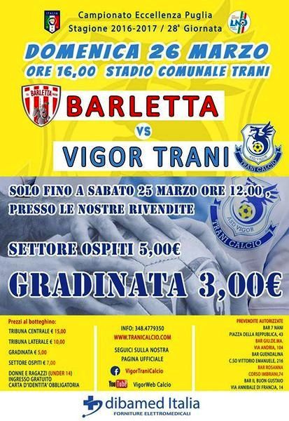 Terz'ultima giornata del torneo di Eccellenza e penultima partita del Trani allo stadio comunale, almeno relativamente alla stagione regolare. Qualora se ne giochi un'altra, potrebbe essere quella del playout (gara unica sul campo della miglior classificata) e questo significherebbe che il Trani si sarà piazzato tra quintultimo e quartultimo posto, le posizioni per disputare in casa lo spareggio.
