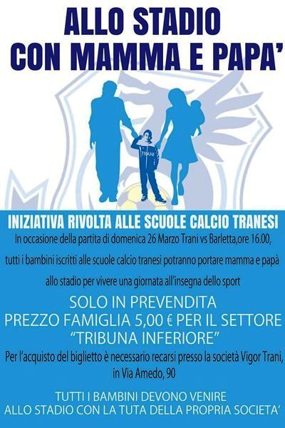 Come anticipato in altro articolo, da parte del sodalizio biancoazzurro c'è l'auspicio che ci sia tanta gente che possa supportare i tranesi verso il traguardo salvezza. Due le iniziative. La prima è rivolta ai ragazzi di tutte le scuole calcio della città, invitati dalla Vigor ad assistere all'incontro assieme a mamma e papà al costo di 5 euro con biglietti in prevendita presso la sede sociale sita in via Amedeo 90. I ragazzi in questione dovranno presentarsi allo stadio con la tuta della società di appartenenza.