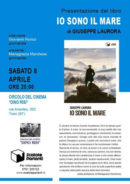 Sabato 8 aprile, alle 20, presso il Circolo del Cinema Dino Risi a Trani, in via Amedeo (angolo via Ciardi) si terrà la presentazione del libro "Io sono il mare" di Giuseppe Laurora. La raccolta di poesie, riflessioni sul mare, sull'uomo e sui suoi sentimenti, rappresenta il terzo lavoro del poeta autodidatta.
