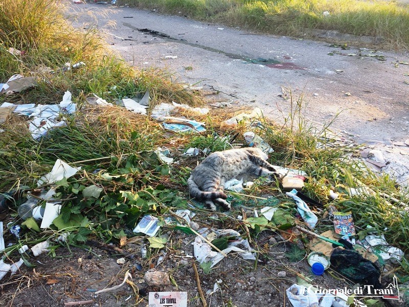 C'è persino la carcassa di un gatto e a mitigare l'impatto visivo, si fa per dire, appare un ombrello con i colori della pace, per un luogo che pace non ha.