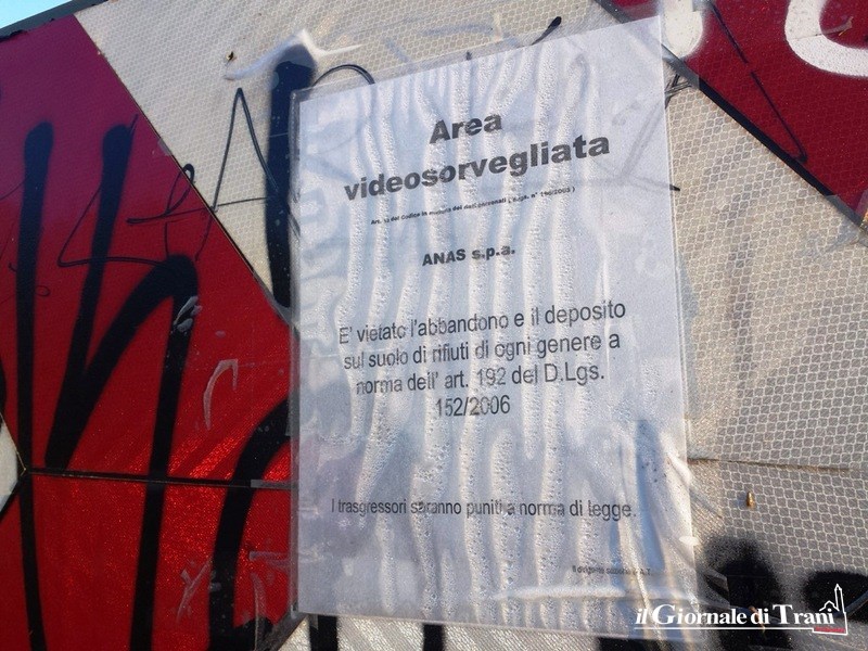 Un beffardo cartello indica quel luogo come «area videosorvegliata». In realtà, non vi si scorgono telecamere e, soprattutto, quel cartello appare particolarmente datato e fuorviante: infatti, la l'ente di rilascio dell'avviso è la società Anas Spa, che da tempo non ha più in carico la strada che collega Trani con Bisceglie, denominata vecchia statale 16 e declassata a strada intercomunale.