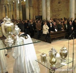 Parte oggi, giovedì 13 aprile, il triduo pasquale e la Diocesi di Trani stamani, come tradizione, si ferma per un momento posto a fondamento della liturgia. Infatti, durante la mattina del Giovedì santo non si celebra l’eucarestia nelle parrocchie, ma si officia un’unica messa, detta “del Crisma”, in cattedrale, alle 10. La presiede il vescovo, Mons. Giovan Battista Pichierri, insieme con tutti i presbiteri e diaconi dell’intera diocesi. Durante la santa messa, un appuntamento particolarmente significativo perché sottolinea la dimensione della chiesa come “comunità e popolo di Dio”, si consacrano gli oli santi e i presbiteri rinnovano le promesse effettuate al momento della loro ordinazione.