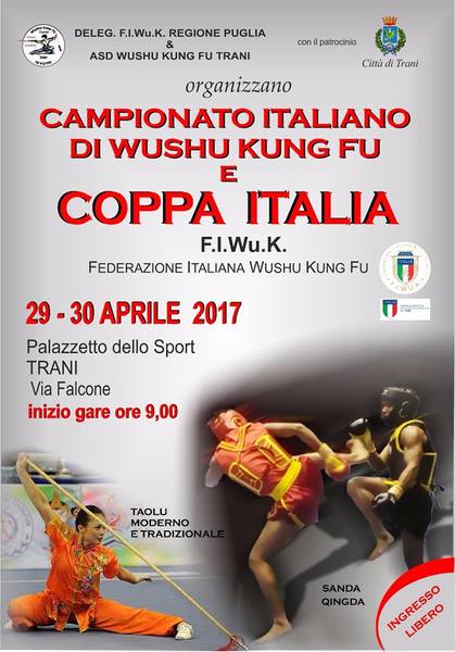 La Wushu kung fu Trani assieme alla FiWuK, la federazione di riferimento, organizzano per il 29 e il 30 aprile prossimi il Campionato Italiano e la Coppa Italia di specialità presso il PalaAssi con inizio competizioni fissato per le ore 9.