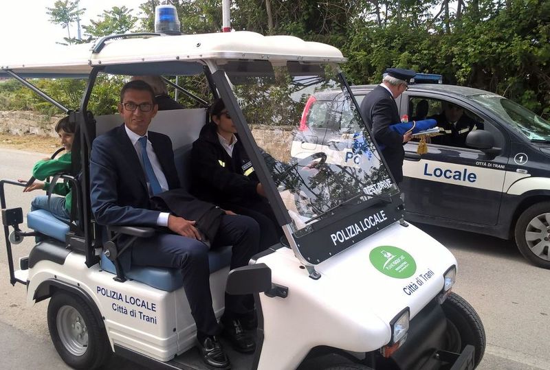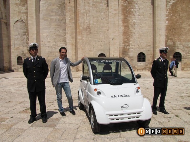 Già nel 2010 la Polizia locale aveva avuto la breve disponbilità di un veicolo elettrico: le fu messo a disposizione dalla Stp. La cerimonia di consegna (foto Traninews) avvenne in piazza mons. Reginaldo Addazi.
