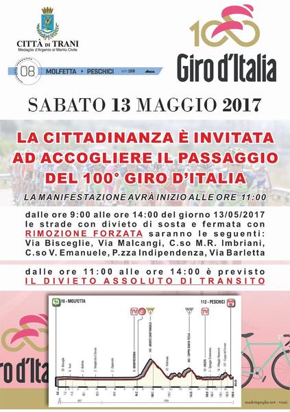 Questi invece i provvedimenti di viabilità adottata durante il passaggio della tappa. È istituito, dalle ore 9 alle ore 14 del 13 maggio, il divieto di fermata con obbligo di rimozione forzata nelle seguenti vie: via Bisceglie (intero tratto) su entrambi i lati della carreggiata; via Malcangi (intero tratto) su entrambi i lati della carreggiata; corso Imbriani (tratto compreso fra via Malcangi e corso Italia) su entrambi i lati della carreggiata; corso Vittorio Emanuele (tratto compreso fra corso Imbriani e piazza della Repubblica) su entrambi i lati della carreggiata; piazza della Repubblica (tratto compreso fra via De Robertis e corso Vittorio Emanuele) su entrambi i lati della carreggiata; corso Vittorio Emanuele (tratto compreso fra piazza della Repubblica e piazza Gradenico) su entrambi i lati della carreggiata; piazza Gradenico (tratto compreso fra via Sant’Agostino e via Alvarez) su entrambi i lati della carreggiata; corso Vittorio Emanuele (tratto compreso fra piazza Gradenico e piazza Indipendenza) su entrambi i lati della carreggiata; piazza Indipendenza (tratto compreso fra via Anseramo e via Andria) su entrambi i lati della carreggiata; via Barletta (intero tratto) su entrambi i lati della carreggiata.
