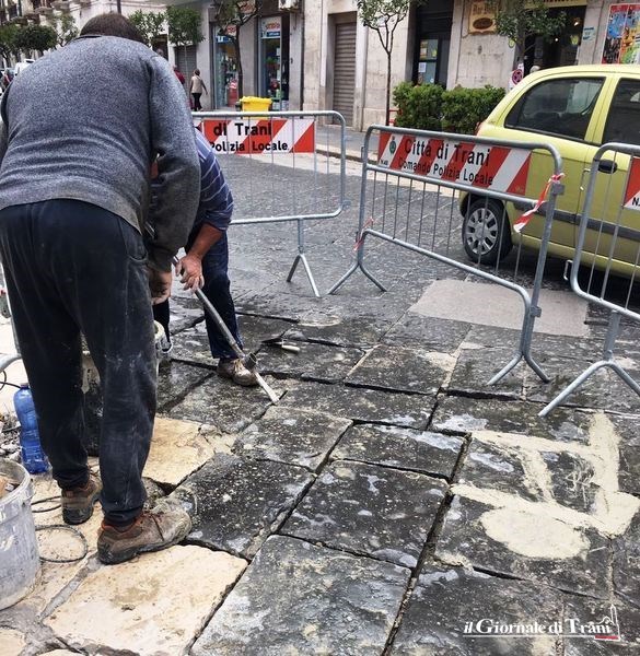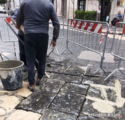Sono già terminati i lavori di sistemazione del basolato di corso Vittorio Emanuele, nei pressi dell'intersezione con piazza Gradenigo. Gli operai dell'impresa Leonardo Napoletano possono pertanto iniziare l'intervento più complicato, che è quello all'altezza dell'incrocio con via Marsala.
