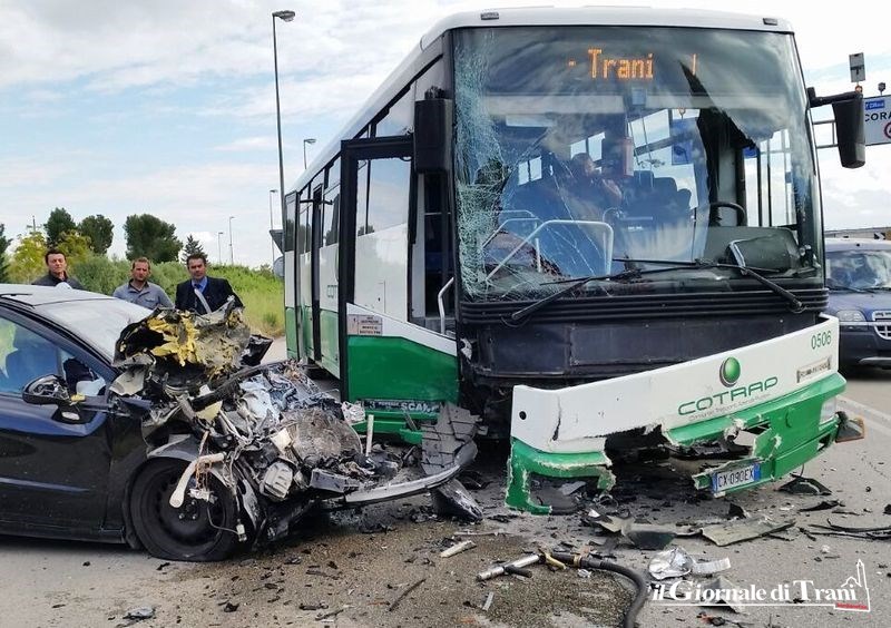 Solo tanto spavento, ma quasi nessuna conseguenza per gli occupanti del mezzo pubblico della Cotrap su cui è piombata la vettura. Solo un passeggero è stato condotto al pronto soccorso di Trani, prevalentemente a causa dello shock in seguito all'impatto della vettura contro il punto del pullman prossimo al suo sedile.