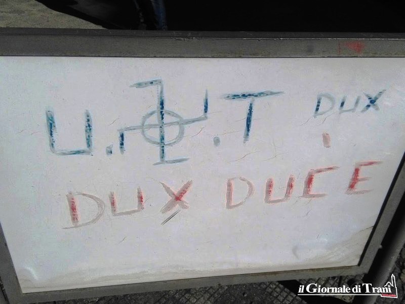 Quello che ci aveva stupito, e su cui avevamo ironizzato, erano le idee confuse del soggetto, che aveva inciso sia delle svastiche, sia scritte quali “Ama Gesù Cristo”, “duce”, “dux”, “ama Berlusconi”.