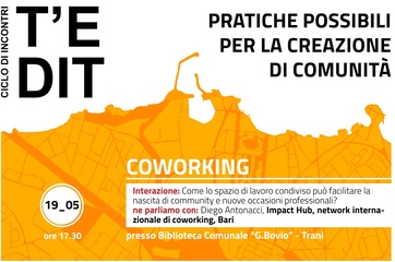 Dopo il bellissimo riscontro dei primi due appuntamenti, si è giunti al terzo incontro di T’E DIT - “Pratiche possibili per la creazione di comunità”, un ciclo di incontri co-organizzati con l'assessorato alla Cultura del Comune di Trani ed aperti alla cittadinanza, che raccoglierà nella città storie 'degne di essere diffuse'.