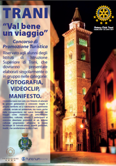 «Educare le giovani generazioni a conoscere meglio il proprio territorio e valorizzarne il patrimonio culturale, sociale ed ambientale». Con questi obiettivi il Rotary club di Trani, la Fondazione Seca e la Pro Loco Turenum hanno ideato, organizzato e sviluppato «Trani val bene un viaggio», concorso di promozione turistica riservato agli alunni degli istituti di istruzione superiore di Trani. Gli alunni interessati hanno presentato elaborati, singolarmente o in gruppo, nelle categorie «fotografia», «videoclip» e «manifesto».