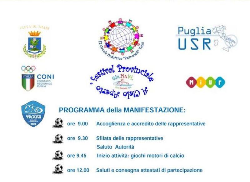 La festa è organizzata dal II circolo didattico “Monsignor Petronelli” di Trani, dirigente Giuseppina Tota. L'evento rientra nell’ambito delle manifestazioni sportive regionali dei Giochi sportivi studenteschi, organizzate dal Coordinatore regionale di educazione motoria, fisica e sportiva Marino Pellico, con il patrocinio dell'assessorato allo sport del Comune di Trani Giuseppe De Michele, del Coni delegazione Provinciale Bat nella figura di Antonio Rutigliano, e con la gradita collaborazione della Asd Apulia Trani '80 Calcio Femminile e della Vigor Trani Calcio, che si ringrazia per la disponibilità e l'attenzione mostrata.