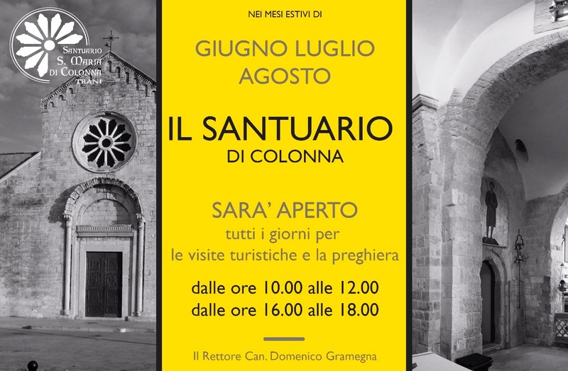 Giugno, luglio ed agosto. Tre mesi pieni per visitare e conoscere, come mai fino ad oggi, il santuario di Santa Maria di Colonna. L'iniziativa è del rettore, don Mimmo Gramegna, parroco dello Spirito Santo che, grazie ad un gruppo di volontari e guide turistiche, ha scelto di valorizzare un'altra delle storiche chiese romaniche sul mare di Trani, segnatamente sulla penisola di Colonna. E così a partire da oggi, giovedì 1mo giugno, e per tutto il mese in corso, e quelli di luglio e agosto, il santuario sarà aperto ogni giorno, dalle 10 alle 12 e dalle 16 alle 18, sia per le visite turistiche, sia per la preghiera.