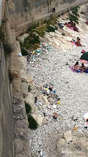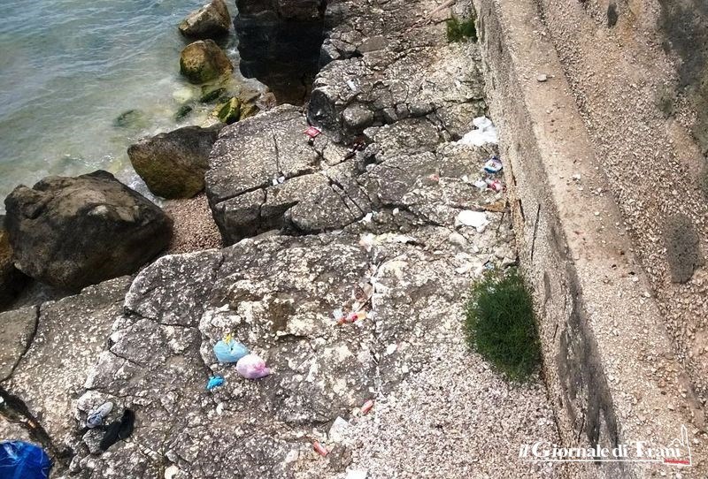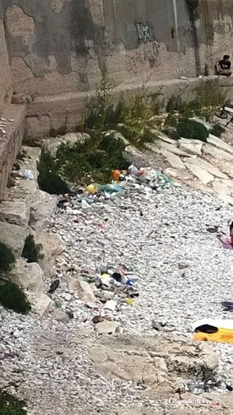 Il degrado sul mare si moltiplica a vista d'occhio. Oggi ci occupiamo dell'incredibile quantità di rifiuti depositata nel tratto di scogliera prossimo allo Scoglio di Frisio, al di sotto di un chiosco bar comunale sito fra via Spalato e via Palermo: la gente fa tranquillamente il bagno convivendo con bottiglie di birra, buste di immondizia e tanto altro.