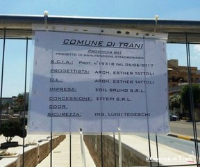 Ad autorizzare i lavori, un cartello in cui compare la segnalazione certificata di inizio attività da parte del Comune di Trani. Sull'insegna il nome del progettista del lido, Esther Tattoli, del responsabile della sicurezza e dell'aggiudicatario della concessione, la Effepi di Corato.
