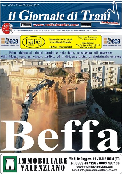 È in edicola il nuovo numero de “Il giornale di Trani”, dal titolo “Beffa”. È quella relativa a villa Maggi, prima ridotta ai minimi termini, in pratica quasi tutta demolita, e solo dopo considerata “di interesse”. Un vincolo tardivo, ed il dirigente ordina di ripristinarla. All’interno del giornale, due pagine dedicate a questo.
