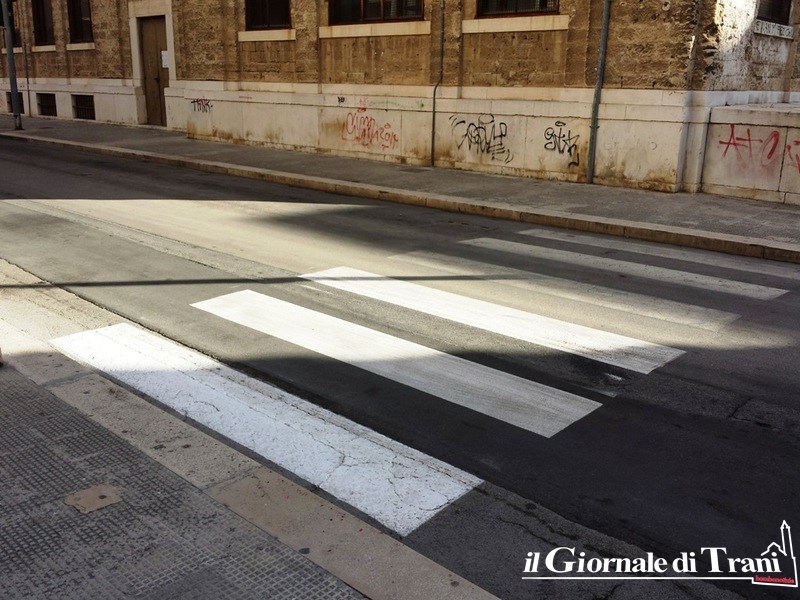 Infatti, sono numerosi gli attraversamenti pedonali che risultano, allo stato, tracciati soltanto parzialmente in seguito a lavori recentemente affidati dal Comune di Trani ad una tuttora non meglio precisata impresa esecutrice.