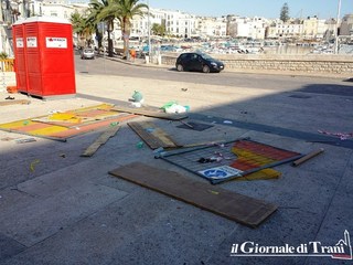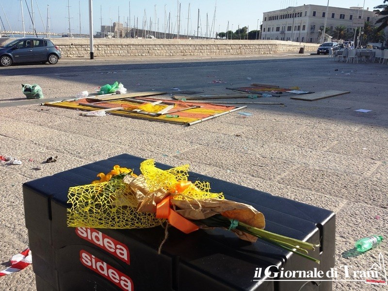 Ma sarebbe stato soltanto il biglietto da visita di quello che, poi, è rimasto stanotte e si è ritrovato stamani: travi, manufatti in plastica, omaggi floreali dimenticati, bottigliette, volantini, brochure della manifestazione e rifiuti di altro tipo, decisamente ingombranti ed imbarazzanti.