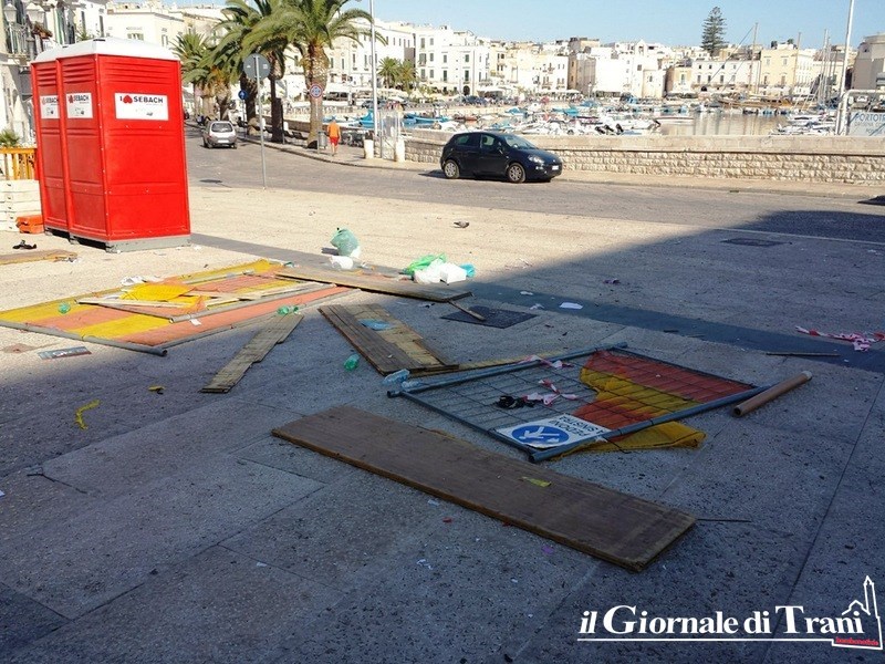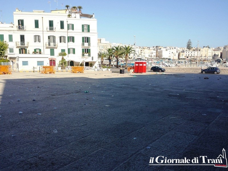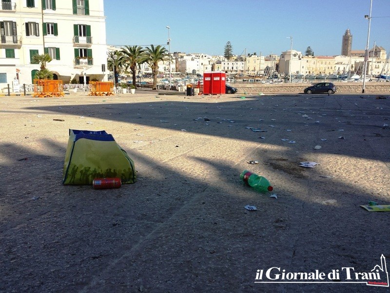 Quando si utilizza un suolo pubblico, per realizzarvi spettacoli, la prescrizione di partenza è riconsegnare alla città il posto nella stessa maniera in cui si è trovato: pulito. In piazza Quercia, invece, questo non è avvenuto e, stamani, la stessa era un tappeto di resti della manifestazione musicale e danzante tenutasi ieri sera con, alle spalle, porto e cattedrale di Trani.