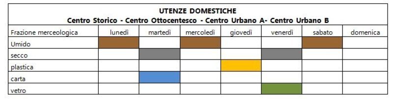 Da oggi, i residenti nell’area del centro dovranno osservare il seguente calendario di esposizione delle frazioni differenziate: organico (umido), lunedì, mercoledì e sabato; secco residuo, martedì e venerdì; plastica e metallo, giovedì; carta e cartone, martedì; vetro, venerdì.