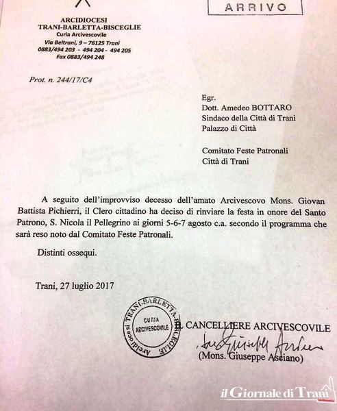 È la conseguenza di una serie di trattative che hanno orientato l'amministrazione comunale, il Comitato feste patronali e la diocesi a posticipare di una settimana di festeggiamenti per San Nicola il Pellegrino, in considerazione della morte improvvisa dell'arcivescovo, monsignor Giovan Battista Pichierri, e del conseguente lutto che ha colpito la città e, in particolare, la diocesi.