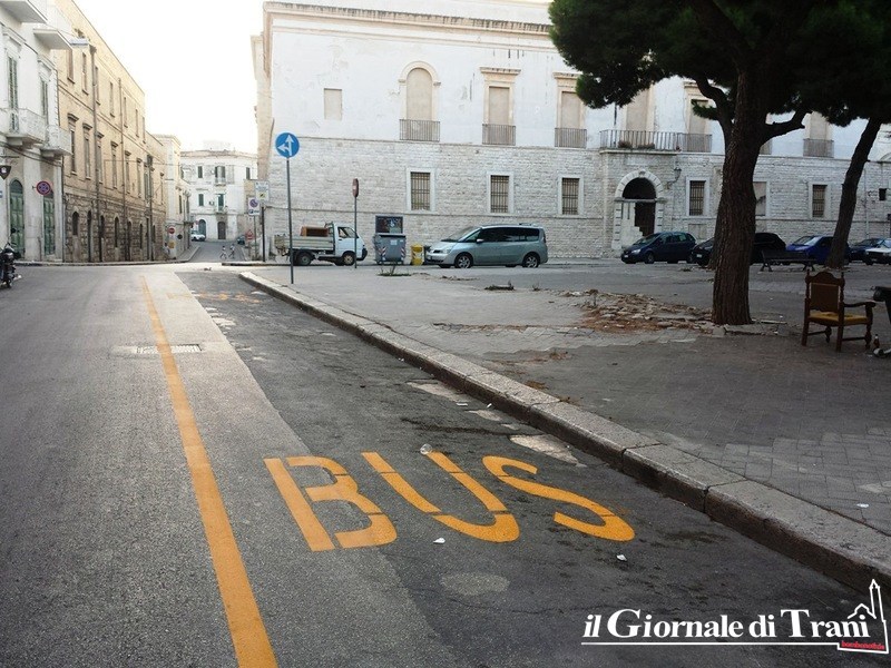 Così, nella parte della piazza compresa tra via Barisano da Trani e via Pedaggio Santa Chiara, è stata tracciata una ben più evidente zona di competenza interamente destinata ai bus, che va ad aggiungersi a quella presente più avanti, in via Alvarez, ed all'altra compresa tra la stessa via Barisano da Trani e via Giovanni Bovio, nella parte centrale della piazza, e che andrebbe nuovamente pitturata perché ormai quasi del tutto cancellata.
