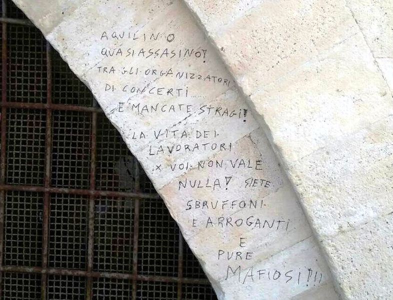 Ha espresso un malessere sociale e il proprio disappunto nel modo più scomposto possibile, accusando di mafiosità coloro che fanno semplicemente il loro lavoro e, soprattutto, deturpando la facciata principale della cattedrale di Trani, l'ignoto – telecamere permettendo - autore di una frase scritta sulla pietra contro gli organizzatori di eventi.