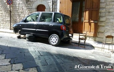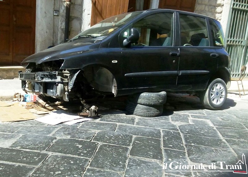 Sempre sul prospetto principale dell'edificio sono comparsi un tendone e del finto verde intorno al balcone principale e, adesso, l'ultimo colpo di teatro è la Fiat Multipla parcheggiata davanti al portone, senza una ruota e poggiata su due pneumatici, che fanno da improvvisato ponte: davvero tutto poco filosofico, provando a scomodare lo stesso Bovio più di quanto questa situazione di degrado non abbia già fatto.
