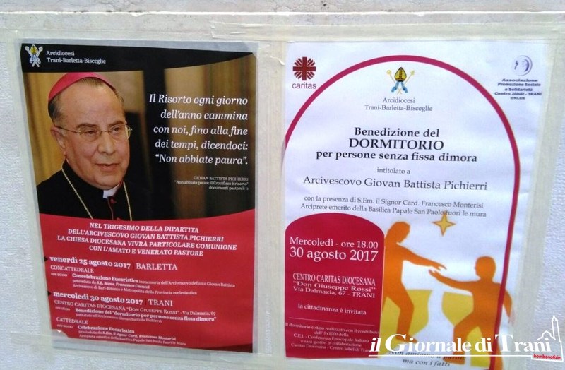 Mercoledì 30 agosto, a Trani, alle 18.00, presso il Centro della Caritas Diocesana “Don Giuseppe Rossi”, in Via Dalmazia 67, il Cardinale Francesco Monterisi, Arciprete emerito della Basilica Papale San Paolo fuori le Mura in Roma, benedirà il “dormitorio per persone senza fissa dimora” intitolato significativamente all’Arcivescovo Giovan Battista Pichierri.