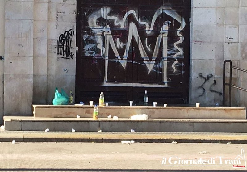È evidente che qualcuno ha passato l'intera notte bevendo alcool senza preoccuparsi di lasciare il luogo pulito. Bottiglie vuote in vetro e plastica, bicchieri, ne sono la dimostrazione tangibile.