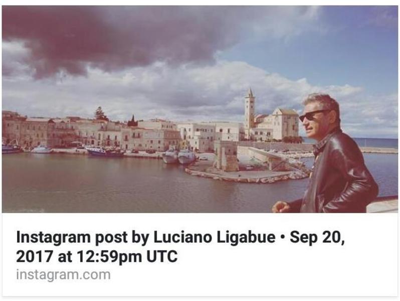 Fan in delirio questo pomeriggio a Trani per la presenza di Luciano Ligabue. Il famoso cantautore, che si trovava in zona perché stasera terrà un concerto a Bari, si è fermato in città per una passeggiata sul porto e in villa. Sul suo profilo "Instagram" ha anche fotografato una veduta panoramica della città ripresa dal fortino. Ligabue sarà a Bari stasera per una tappa del "Made in Italy tour".
